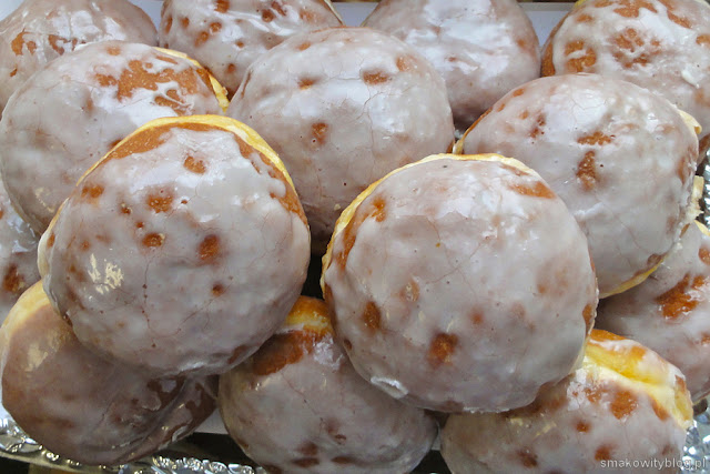 - Część pączków posypać cukrem pudrem, część polukrować i posypać kandyzowaną skórką pomarańczową.