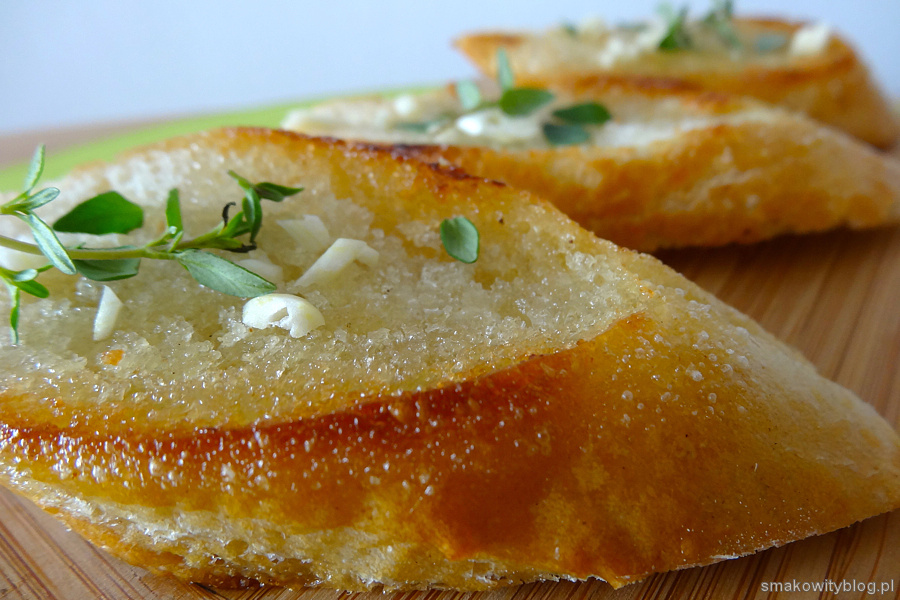 - Z kromek bagietki robimy grzanki. Roztapiamy masło na patelni i smażymy z każdej strony na złoty kolor.