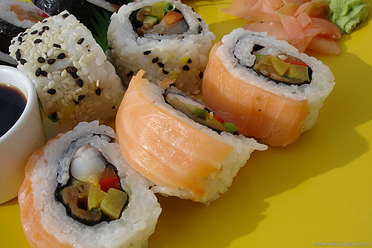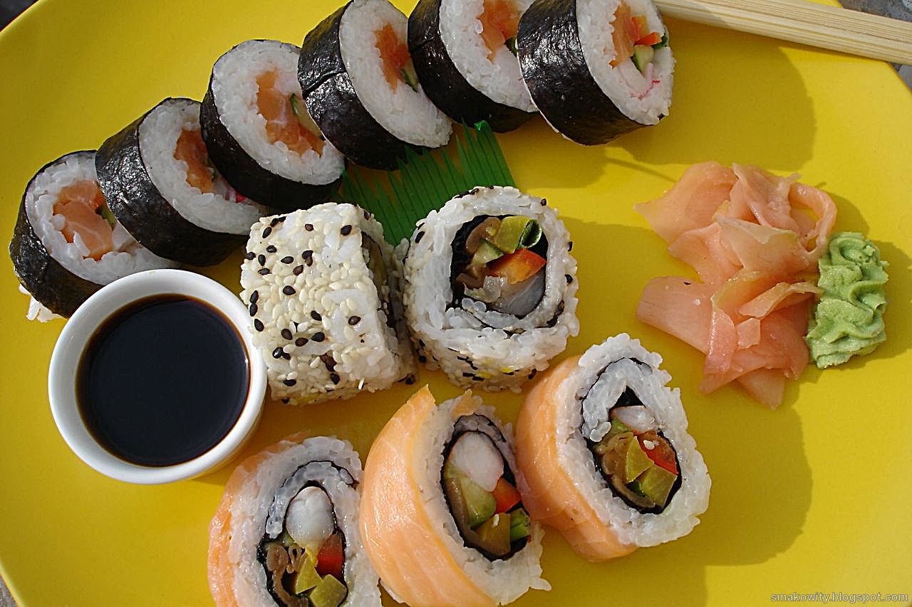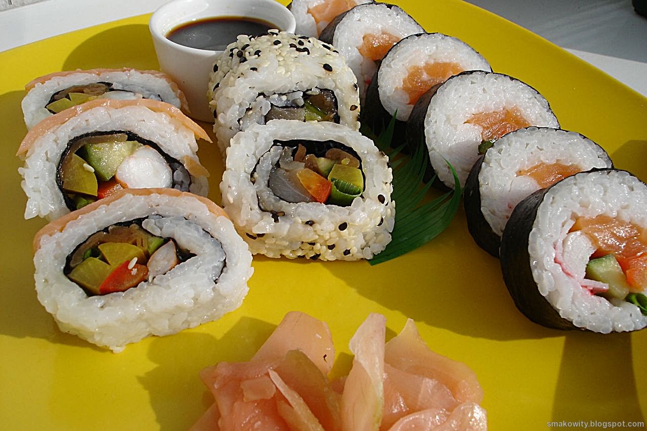 - składniki nadzienia do wyboru: ogórek zielony, awokado, marynowany łosoś, paluszki krabowe, czerwona papryka, ryba maślana, tuńczyk, krewetki