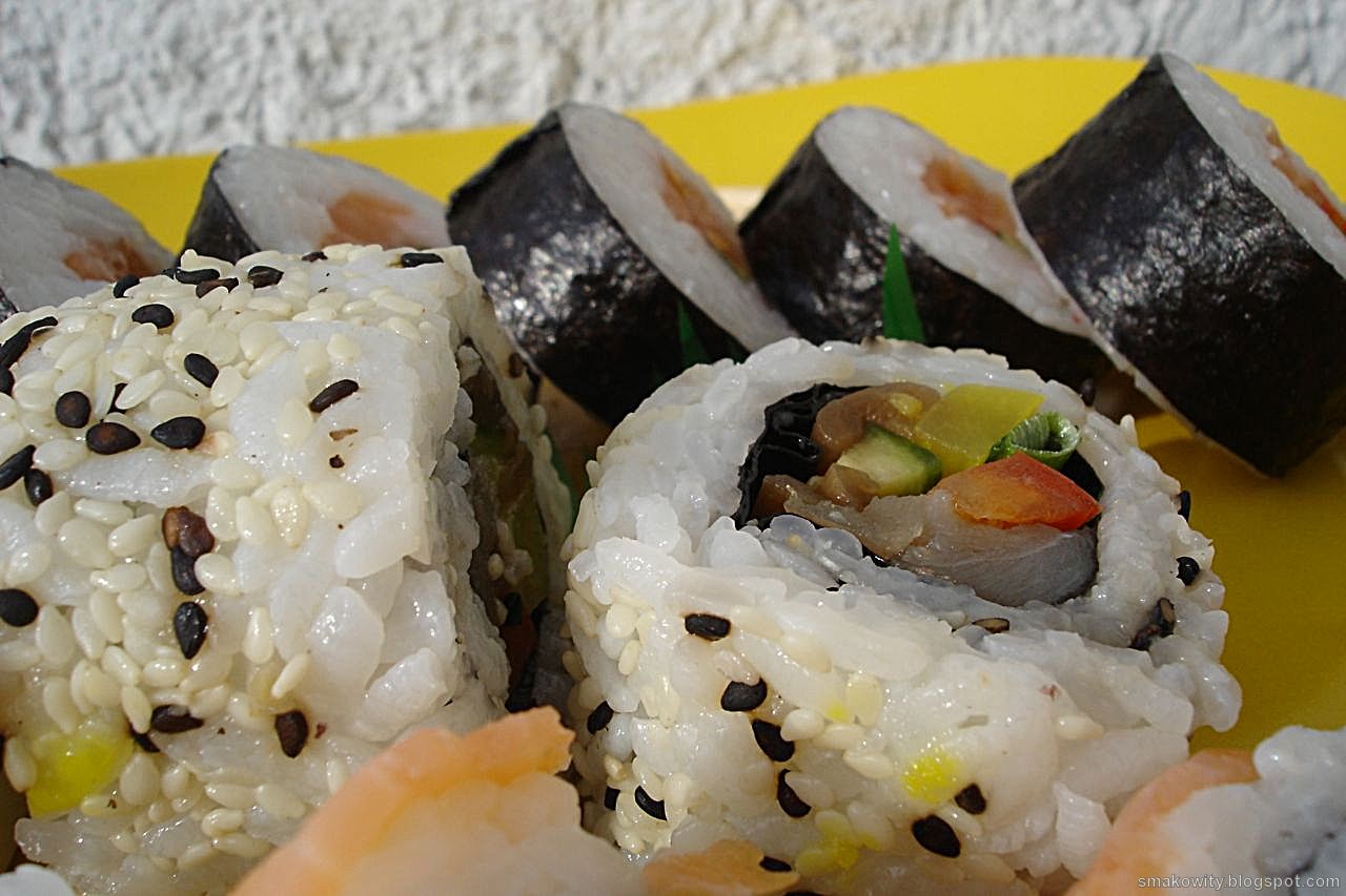 - Uramaki - rolowane na odwrót, ryż znajdujący się na zewnątrz ozdobiony jest drobną ikrą lub smażonymi ziarnami sezamu