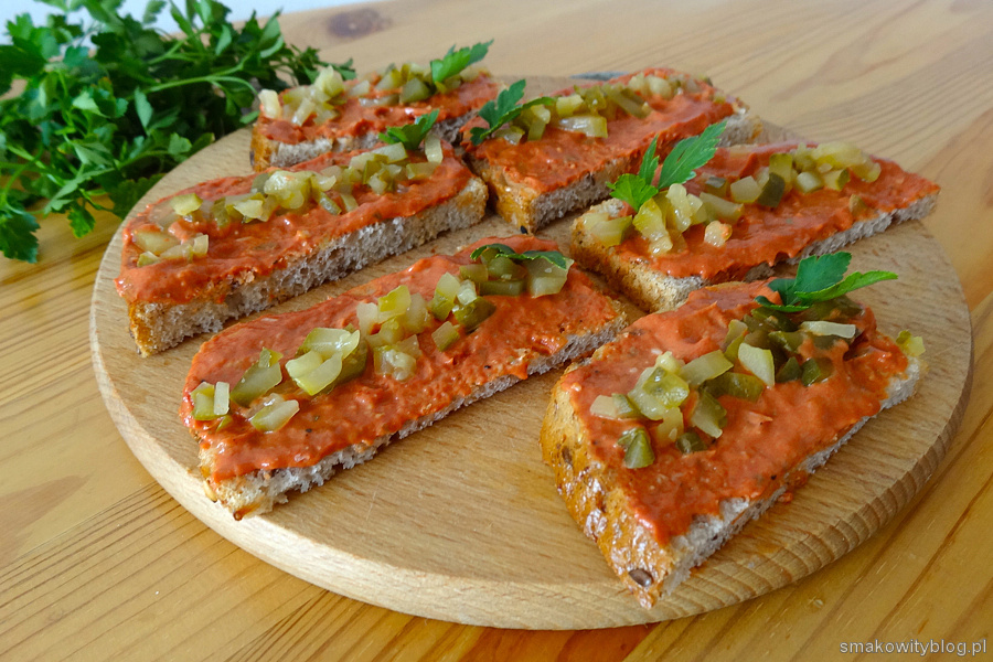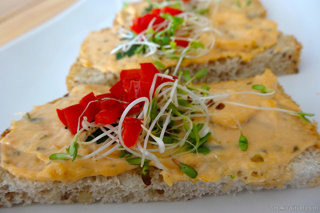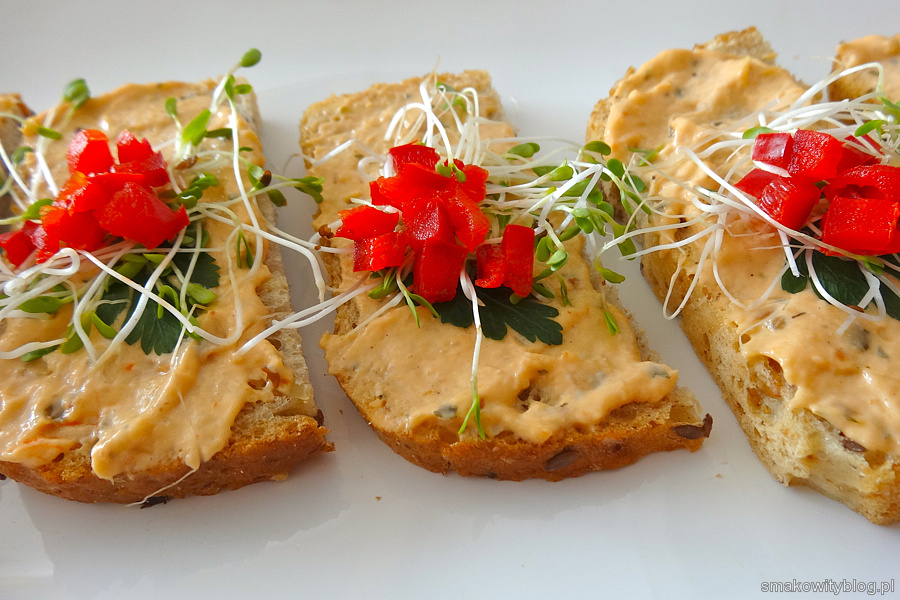 - Nakładamy pastę na kromki chleba, przybieramy kiełkami rzodkiewki i lucerny i nakładamy czerwoną paprykę.