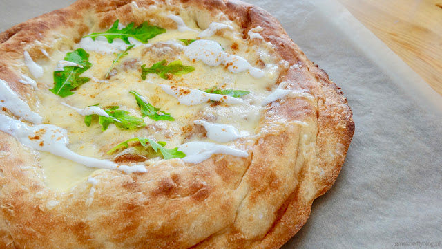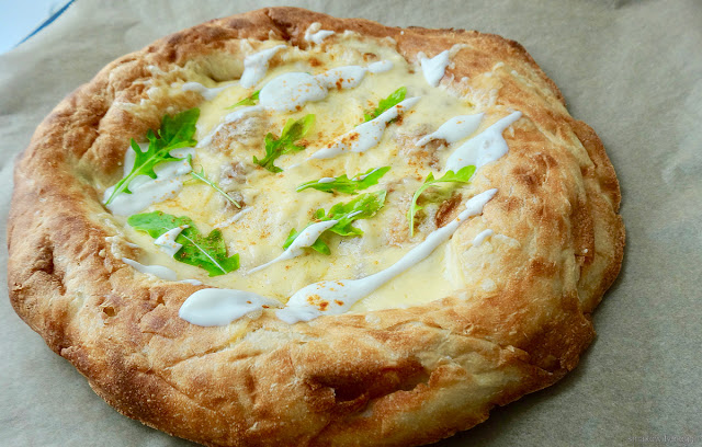 - Podajemy gorące polane sosem i posypane żółtym serem, ozdobione listkami rukoli.