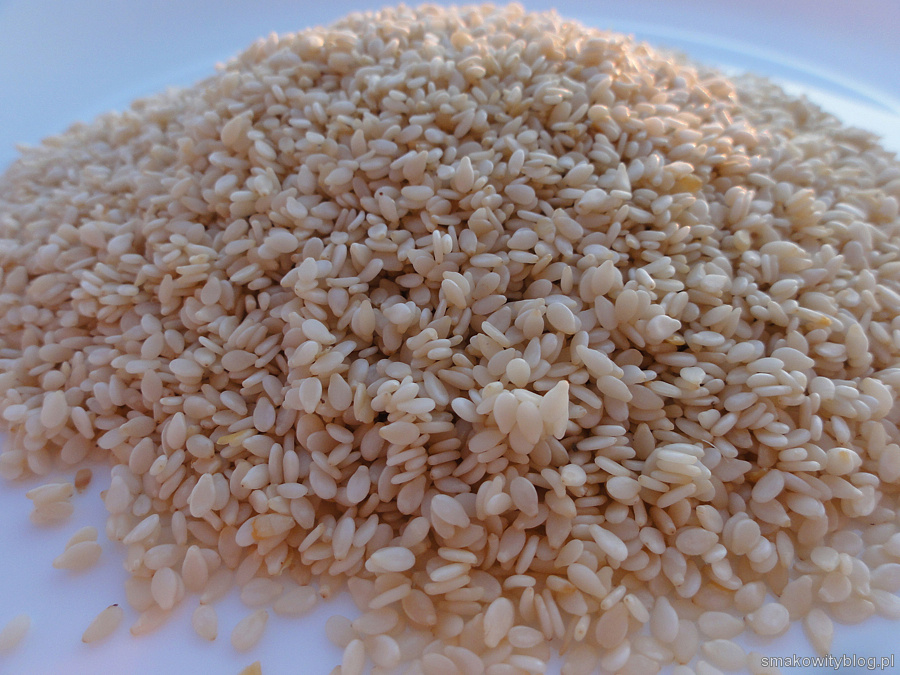 - Ziarno sezamowe uprażyć na suchej patelni, uważając aby je nie przypalić.